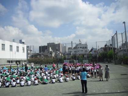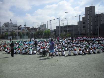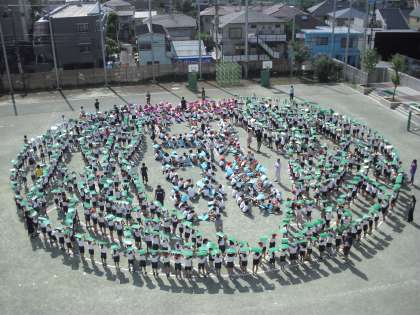 航空写真を撮りました。雨のため、当初の予定日19日(水)から翌日の20日(木)に延期されました。校庭に描かれていた校章のデザインも大雨で全部消えてしまい、翌日の朝再び描かれました。そして2時間目。全校児童が様々な色のボードを持って校庭に集合し、決められた位置に並んでいきます。校舎の屋上から佐生先生の指示でボードを見せるリハーサルをして準備万端。すると、南の空からセスナが現れ、校庭上空を大きく3周して撮影成功です。再び南の空へセスナが去っていくのを見送って終了しました。どんな写真になるのか、今から楽しみです。
