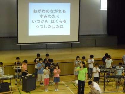 今月の音楽朝会の歌は「ゆめのせかいを」です。今日の体育館の中はさほど暑くありません。1年生は遠足でいませんでしたが、みんなで元気よく歌いました。高学年と低学年でアルトとソプラノのパートに分かれて歌いました。全員で合わせると声が重なってとてもきれいに聞こえました。