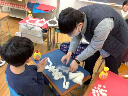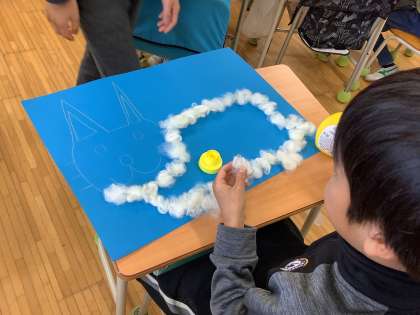 綿を貼ってふわふわの動物を作っています。 かわいい動物に仕上がりそうです。