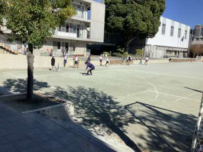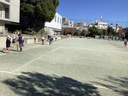 6年生は校庭でティーボールの学習をします。チームでゲームをするために、バッティングやボールキャッチの練習をしています。