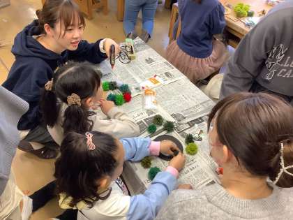 日大文理学部の学生サークルSSGの皆さんが「クリスマスを彩ろう」ということでリース作りの講座をを開いてくれました。マンツーマンに近い形で作り方を教わり、すてきなリースが出来上がりました。お家で飾るのが楽しみですね。