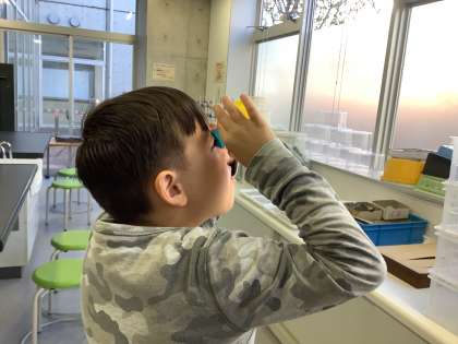 今日はペットボトル顕微鏡で塩の結晶を見ました。(結晶を見るには明るさが必要ですが、目を痛める可能性があるため、太陽は絶対に見ない。長い時間見ない。などの注意事項を書いた紙を持たせて伝えましたので、お家で見る際は気をつけて見るようにしてください。)