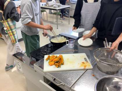 北海道の中川町は、下高井戸商店街や松沢小学校と交流をしています。今月は、中川町からいただいたじゃがいもやかぼちゃを使った料理に6年生が挑戦しています。今日は、家庭科室からコンソメの美味しい匂いが漂ってきました。