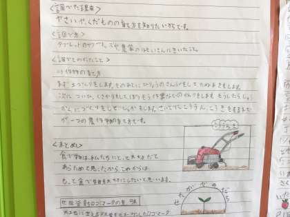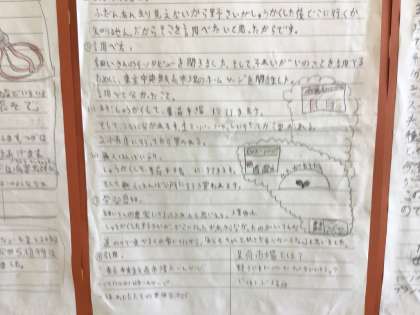 畑見学などで調べた農家の方々の工夫について、報告文を書きました。国語の「仕事のくふう、見つけたよ」で学習したことを基に、読む人のことを考えながら作りました。