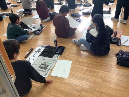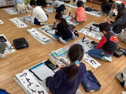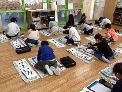 教室を広く使って、書き初めの練習をしています。3年生は「つよい力」4年生は「美しい空」です。気を付けるポイントをおさえて、慎重に書いています。