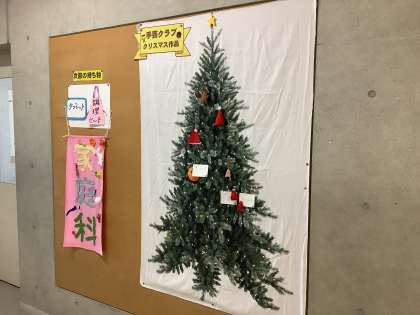 クリスマスのツリーに、手芸クラブの作品が飾られています。フェルトなどで作ったクリスマスのオーナメントがとてもかわいらしいです。