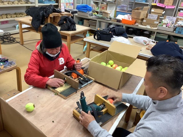今日は「松沢ベースボールクラブ」のお父さんたちが、600個のテニスボールに穴を開ける作業を行ってくださいました。
