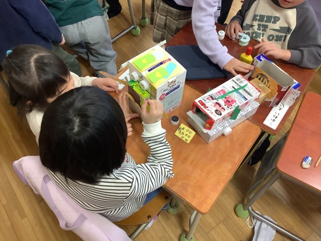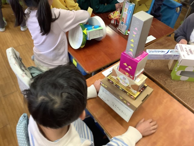 2/20 箱と箱を組み合わせて 1年生 公開日 2025/02/20 更新日 2025/02/20 できごと 1年生の図工の様子です。箱と箱をつなぎ合わせて思い思いの作品を作りました。作った作品について友達に説明し合いました。 いいね(0)