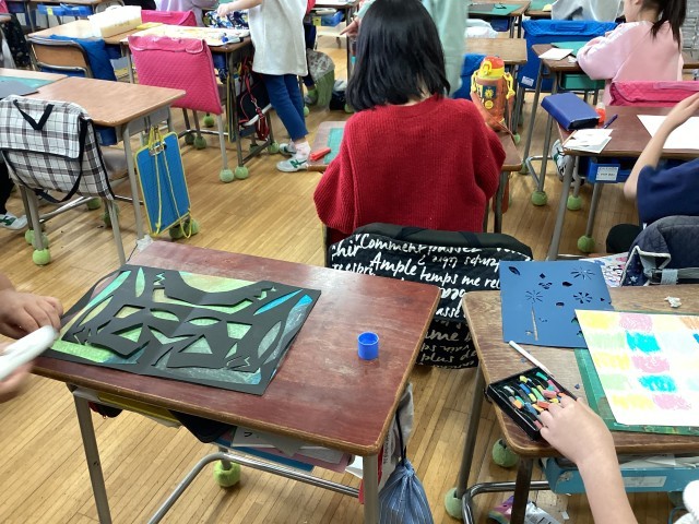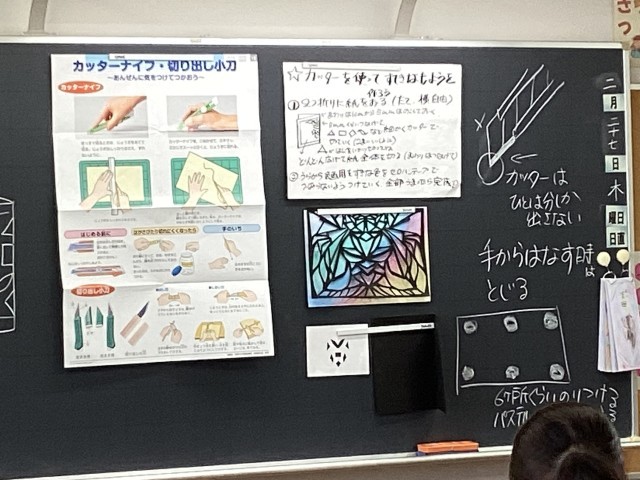 カッターの安全な使い方を確認した後、すてきな模様作りにチャレンジしています。