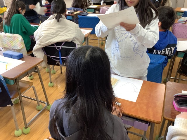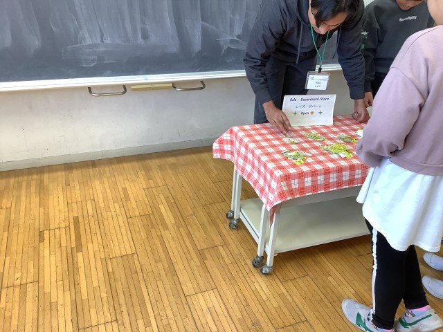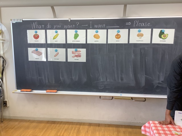 英語で会話をして、ピザの具を集めて、オリジナルのピザを作りました。