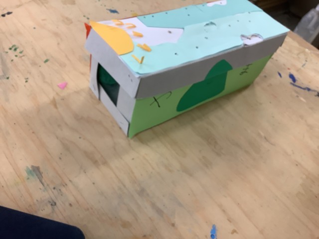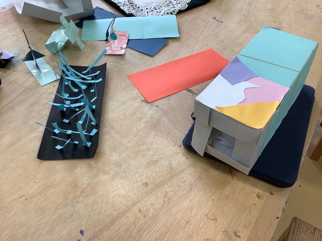 5年生は箱の中にビー玉を入れて動かす作品を作っています。人の動きを考えて、形を工夫します。