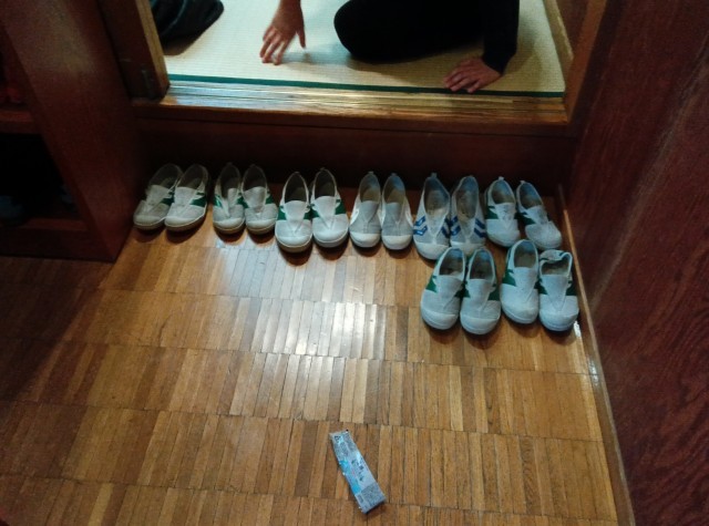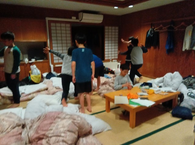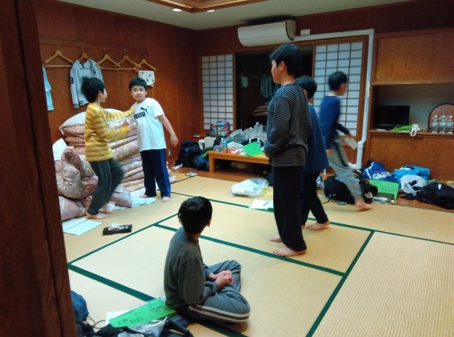 入浴後の部屋では、寝る準備をしたり、ハガキを書いたり様々に過ごしています。靴がそろえてあって、素晴らしい。