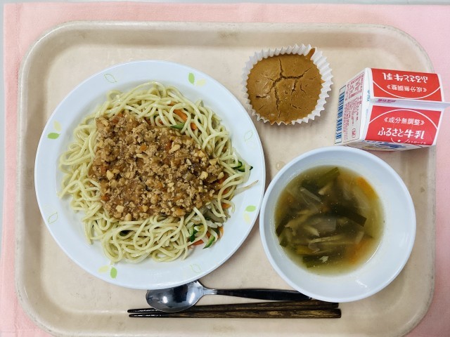 甘辛い肉みそ、野菜、麺を混ぜて食べます。