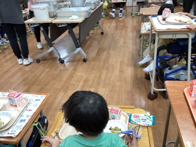 4月と5月生まれのお誕生日を祝いました。給食の牛乳で乾杯しました。