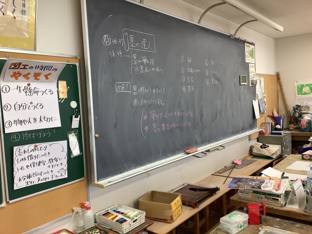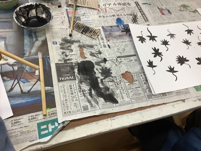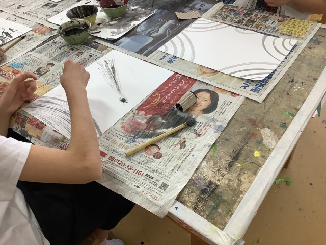 6年生は墨汁を使って、水墨画に挑戦しています。筆先を使った細かい表現や、水で墨を薄めて濃淡を使った表現など、墨の特徴を生かしたやり方を試しています。