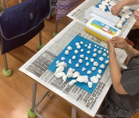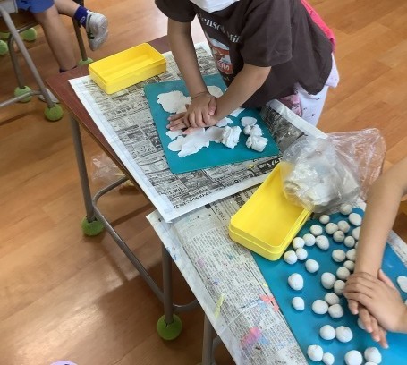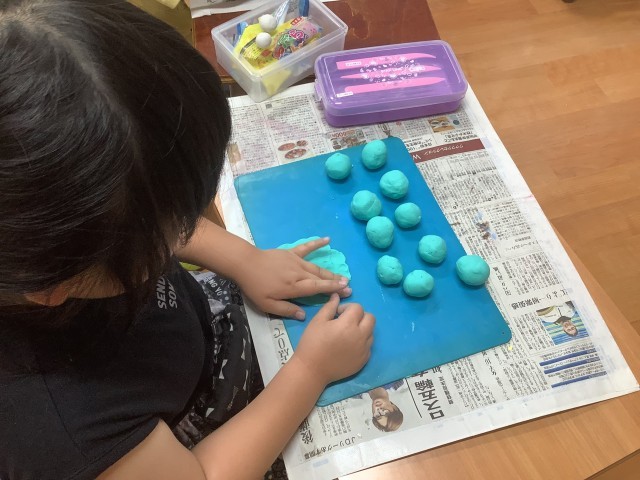 油粘土を丸めたり平らにしたりして遊んでいます。