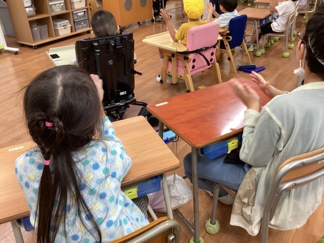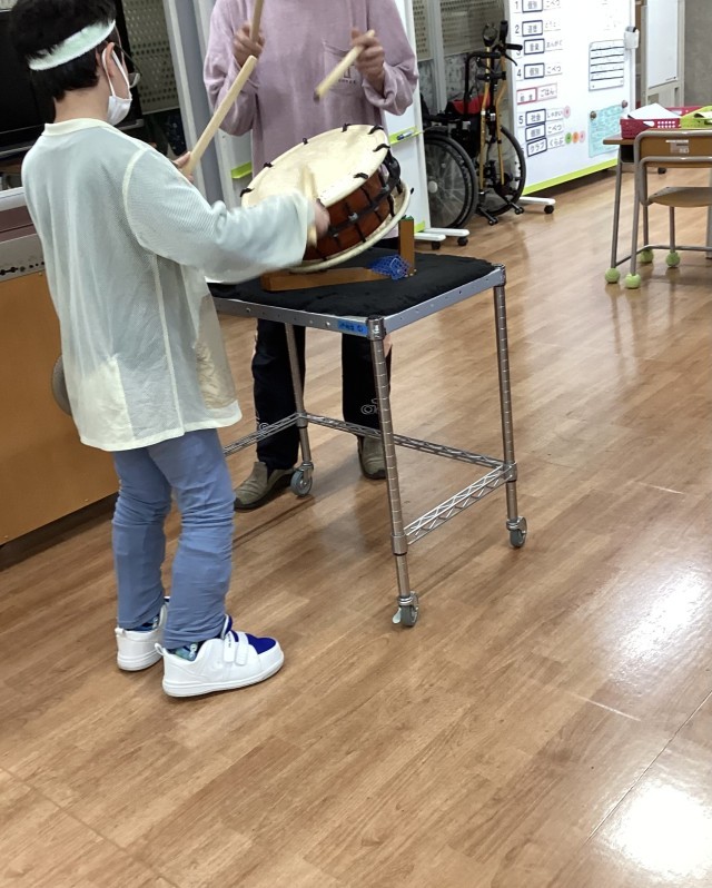 音楽でお祭りのリズムを作り、太鼓を叩きました。