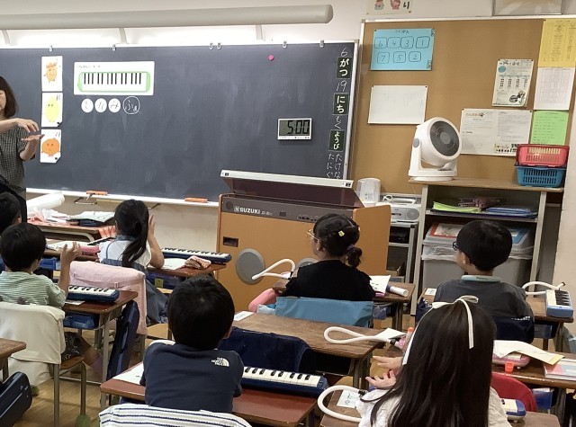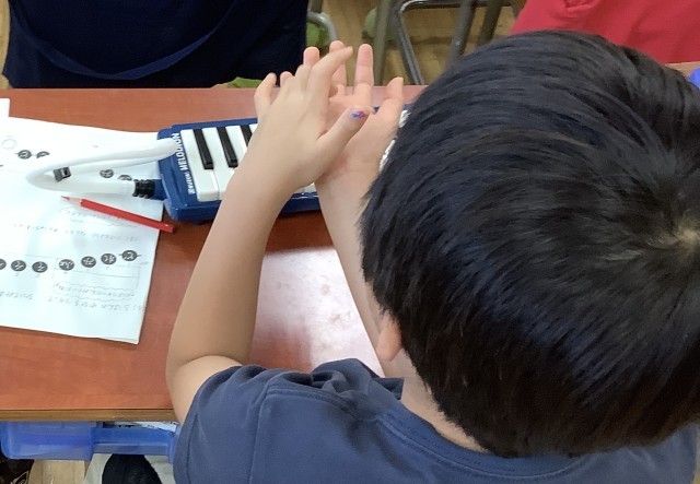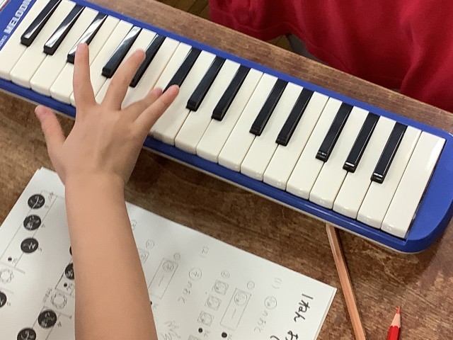 1年生はけんばんハーモニカを練習しています。指遣いを確認して、少しずつ上達しています。