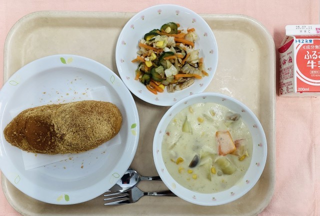 7/2 本日の給食 公開日 2025/07/02 更新日 2025/07/02 できごと 【献立】きなこあげパンコーンシチューりっちゃんのサラダ********************今日のBookメニューは「サラダでげんき」からでした。お話に出てくる野菜やハム、おかか、昆布を入れて、具だくさんの元気になれるサラダが出来上がりました。 いいね(0)
