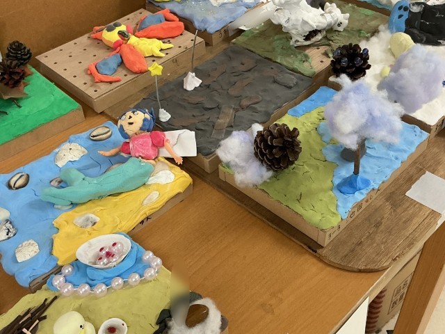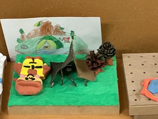 3年生の紙粘土を使った作品が出来上がります。主人公がどんな場所で何をしているところか、想像すると楽しそうです。