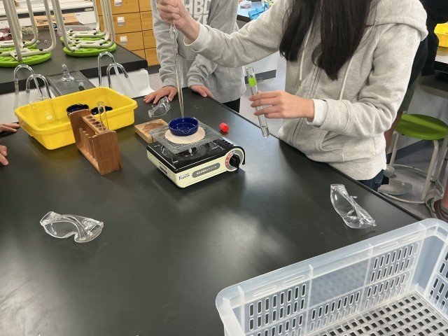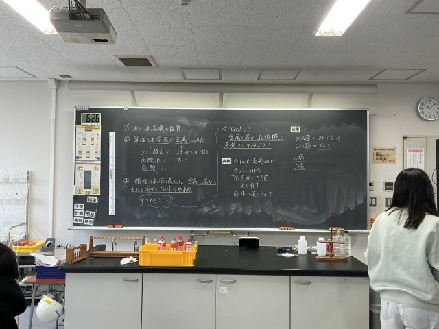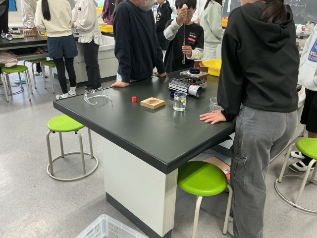 6年生は、金属を溶かした塩酸を熱するとどうなるのか調べました。いろいろな水溶液の特徴を学びます。