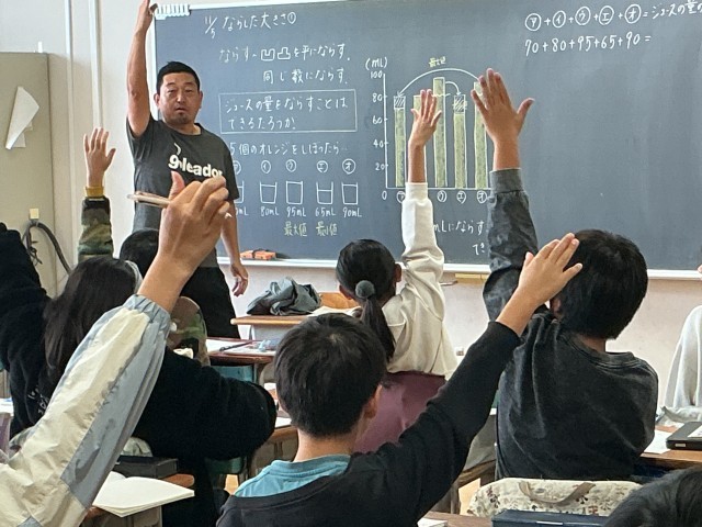 いくつかあるジュースの量を同じにできるか考えます。「平均」につながる学習です。