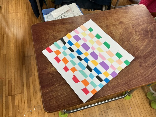 2年生はカッターの使い方を習いました。直線や曲線、ギザギザの線など、安全に気をつけて切ったところに、カラフルな紙を通してきれいな模様を作りました。