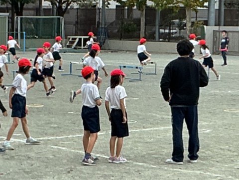 気温がずいぶん下がってきましたが、3年生は元気にミニハードルに挑戦しています。