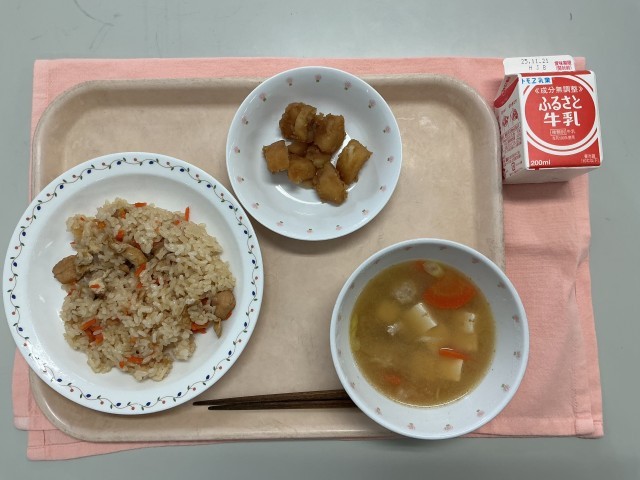 今日の「すがたを変えた大豆」は、こぎつねごはんの油揚げとしょうゆ、じゃがいもの甘辛煮のしょうゆ、つみれ汁のみそと豆腐です。