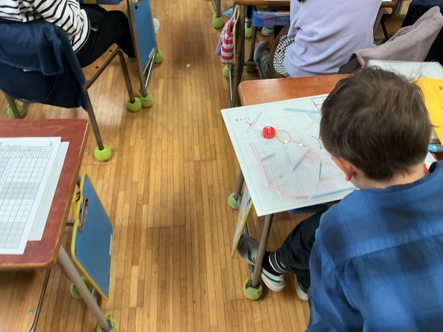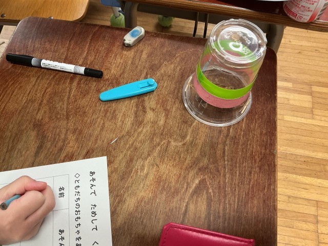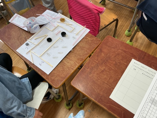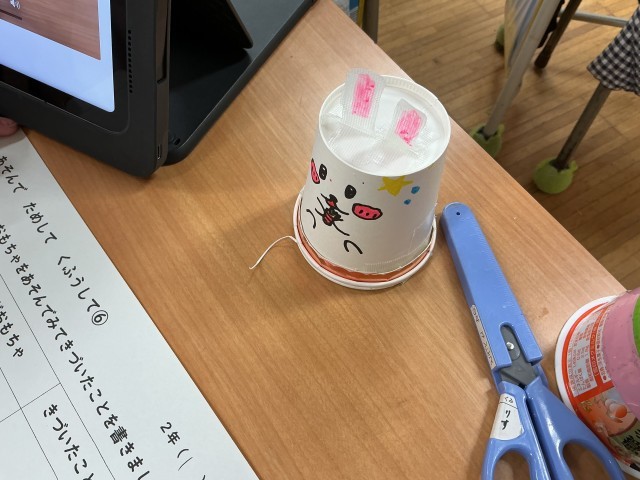 2年生は、いろいろな材料を使って、おもちゃを作りました。何度も試しながら、くふうして作ります。