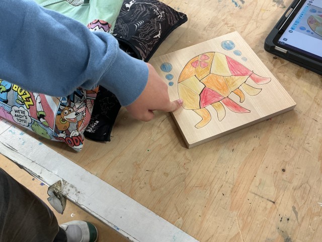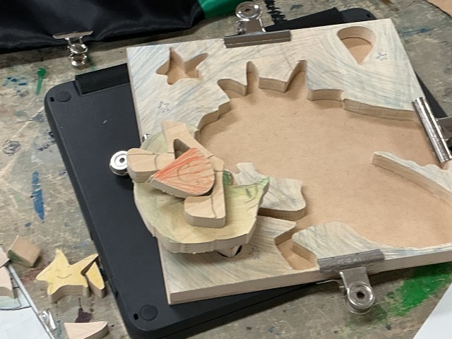 5年生の木製パズルが完成します。糸鋸を使って、直線や曲線など、複雑な形に切り取ったパズルです。おもしろい形がたくさんあります。