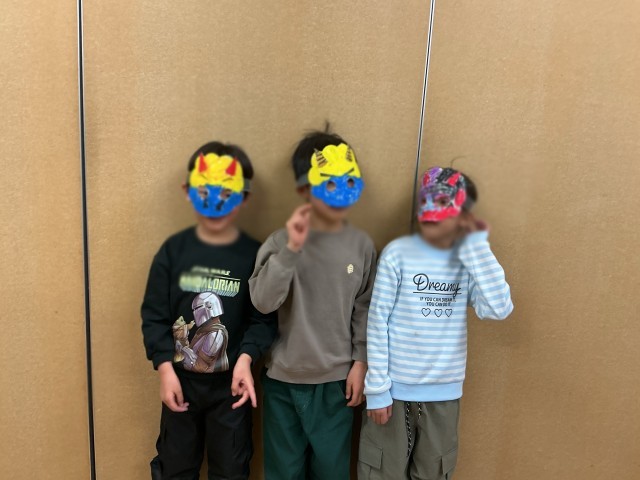 節分について学習しました。年豆や飾りなどの風習や文化を紹介した後、クレヨンで塗った鬼の面と、毛糸を結んで作ったお豆を使って豆まきを行いました。