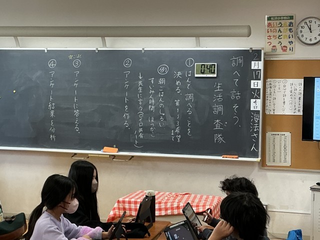4年生は、国語で「調べて話そう生活調査隊」の単元を学習します。みんなにアンケートをとって、調べたことを分析してまとめます。何を調べるか、グループで相談します。