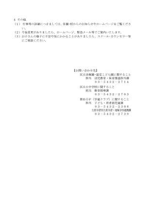 世田谷区教育委員会より保護者に向けて、「感染拡大防止に向けて」のお知らせがありましたので、配布文書に掲載してあります。引き続き、各ご家庭のご協力をお願いいたします。 -