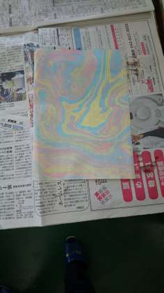 美術ではマーブリングインクを使ってマーブリング染めをしました。何色を垂らすのか、どのように混ぜるのか、いろいろ試し、不思議な模様を楽しみました。