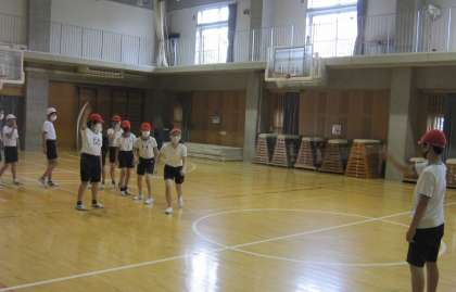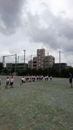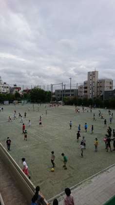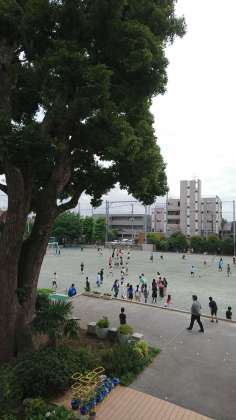 1年生が体育をしています。2学級で校庭を使っていますが、1年生だとまだ広く感じますね。松沢小学校は学級数が多いので、校庭体育も高学年の各学級1時間分以外は複数の学級で使用します。