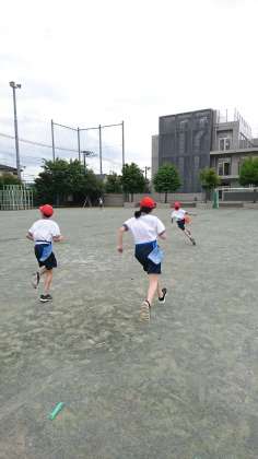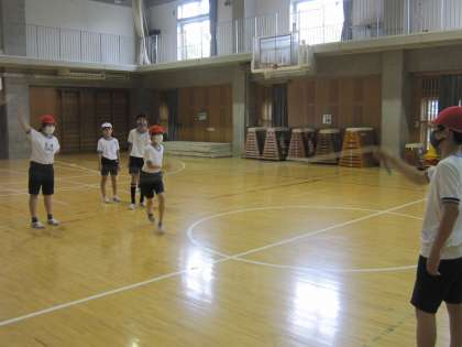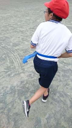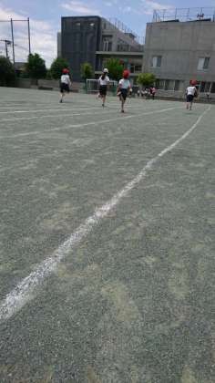 5年生が体育で校庭を全力疾走!フラッグを使って、接触を避けたゲームをしていました。思いっきり走って汗びっしょり。
