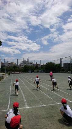3年生は体育で短距離走をしていました。まずはスタートの練習をして、50mの記録を計測します。だんだん体も大きくなって、走りも力強いです。