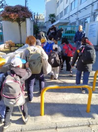ひまわり学級の子どもたちが、無事に学校に到着しました。帰りは、大根が入ったリュックサックを背負いながらバスを乗り継いで帰ってきました。自分が抜いた大根を大事に持ち帰ってほしいです。