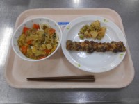 【献立】 牛乳 カレーうどん ポテトとじゃこのサラダ ちくわの磯辺あげ 【主な食材と産地】 たまねぎ 北海道 じゃがいも 北海道 にんじん 千葉県 ...