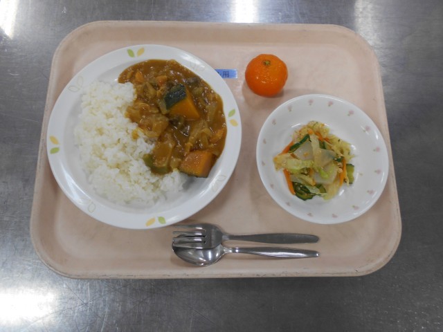 【献立】 牛乳 夏野菜のカレーライス こんにゃくサラダ くだもの(冷凍みかん)