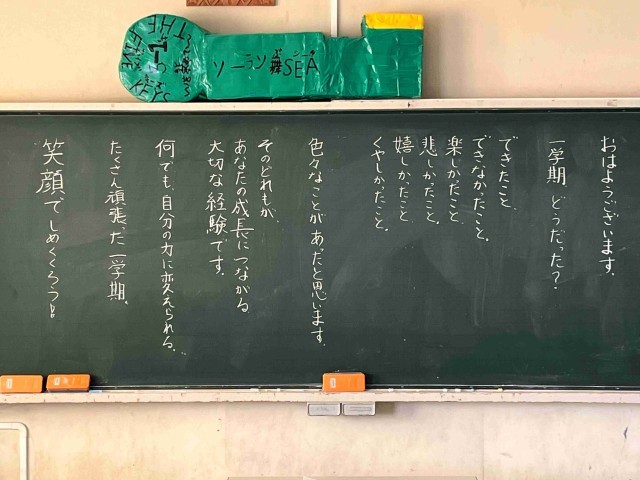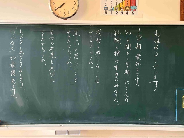 終業式では、ひまわり学級と5年生の代表の子が1学期を振り返って話をしてくれました。「憧れていた応援団の太鼓に立候補し、やり遂げたこと」「運動会の表現をがんばったこと」「学校が楽しくなった、月曜日が待ち遠しくなったこと」「移動教室で急な坂をがんばって登ったこと」「これからも頑張って、楽しく過ごしたいと思っていること」など、大きく成長した様子が感じられました。交通事故などに遭わないよう、「い」命を大切にしてくださいねと話しました。2学期に元気な子どもたちに会えるのを楽しみにしています。1学期も教育活動にご理解、ご協力くださり、ありがとうございました。2学期もよろしくお願いいたします。