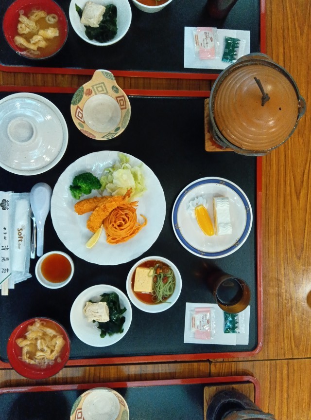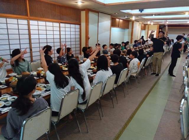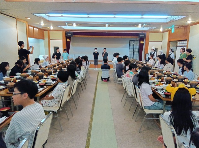 1日目の夕食です。「お腹が空いた〜」という声がたくさん聞こえてきました。たくさん食べて、明日に備えてほしいと思います。