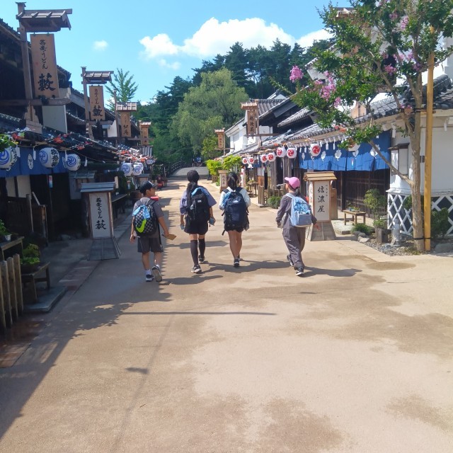 日光江戸村での楽しい時間も、残りわずかとなりました。活動班ごとに時間を見ながら、集合場所に向かっています。