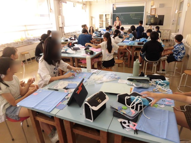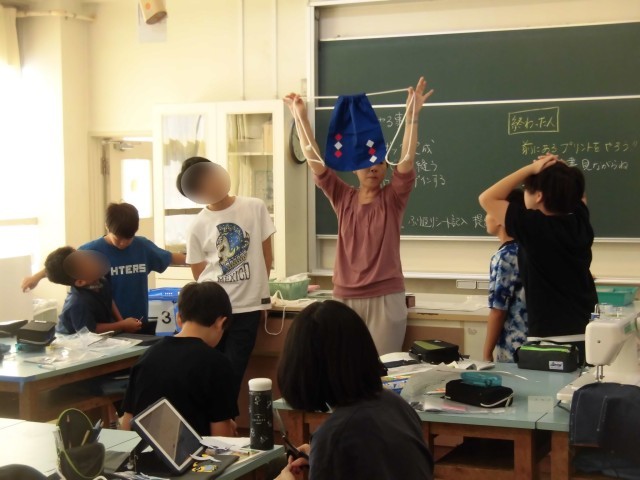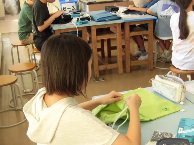 6年生の家庭科では「思いを形にして生活を豊かに」の学習で1学期からナップザックづくりに取り組んでいます。身の回りの布製品を、目的に合わせて布を選んだり、形や大きさや縫い方を工夫してミシンを使って制作します。1学期からひとつひとつの工程に丁寧に取り組み、今日は紐を通したり、アップリケでデザインをしてアイロンで貼り、完成をめざしました。完成したナップザックを見て「おー!できたー!!」とたくさんの笑顔が見られました。