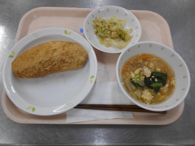 【献立】 牛乳 きなこあげパン 野菜の中華風味 白菜と春雨のスープ