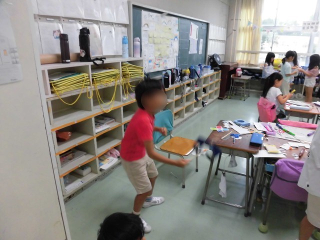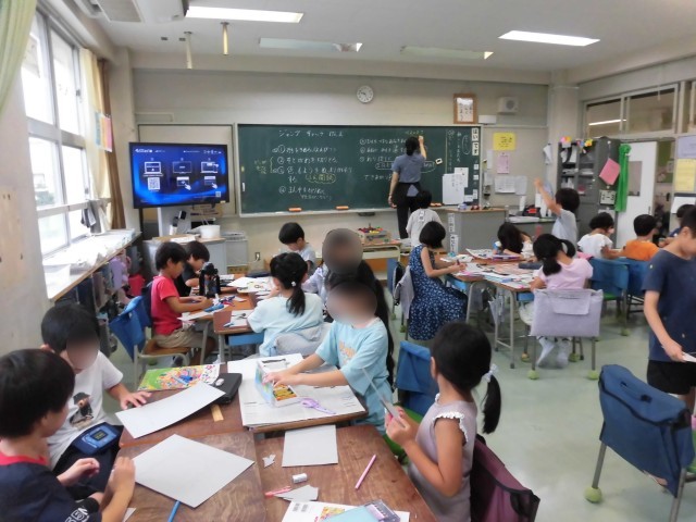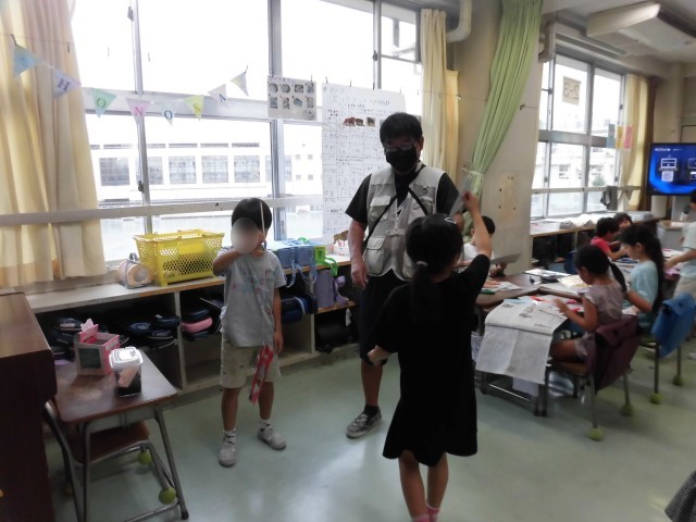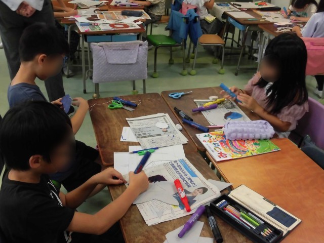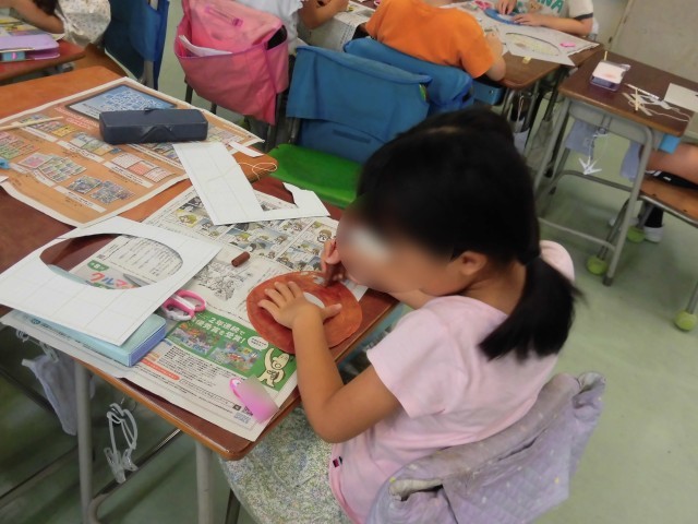 2年生の図工で工作用紙と割りばしを使って「紙けん玉」の制作をしています。作りたい形を決めて、画用紙に下書きをして切り取り、色を塗り、真ん中をくりぬきます。たこ糸を付けたわりばしをつけたら完成です。大好きな生き物や食べ物の形など、面白いけん玉がたくさん出来上がりました。どうやったら成功するのか、穴の形や大きさも考えました。出来上がった紙けん玉でみんなで遊びました。なかなか難しく、何回もチャレンジして、「先生!はいった!!」と喜んでいる様子がみられました。