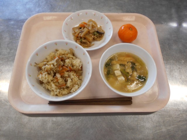 【献立】 牛乳 鶏ごぼうごはん 切り干し大根とさつま揚げの煮つけ 吉野汁 冷凍みかん