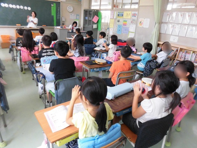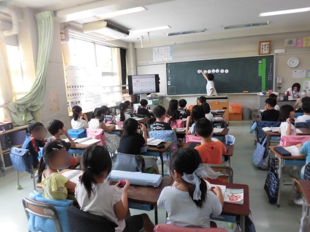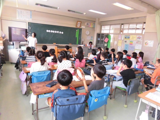2年生の音楽では「2拍子」のリズムの学習をしています。タンブリンとカスタネット、それぞれの楽器で2拍子の違うリズムを練習し、拍にのって演奏しました。2つの楽器のリズムを重ね合わせて演奏を楽しみました。体を動かしながらリズムをとり、一生懸命に取り組むことができました。