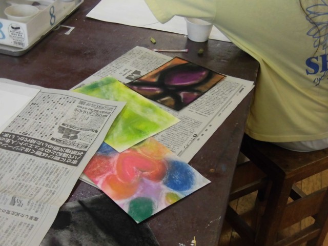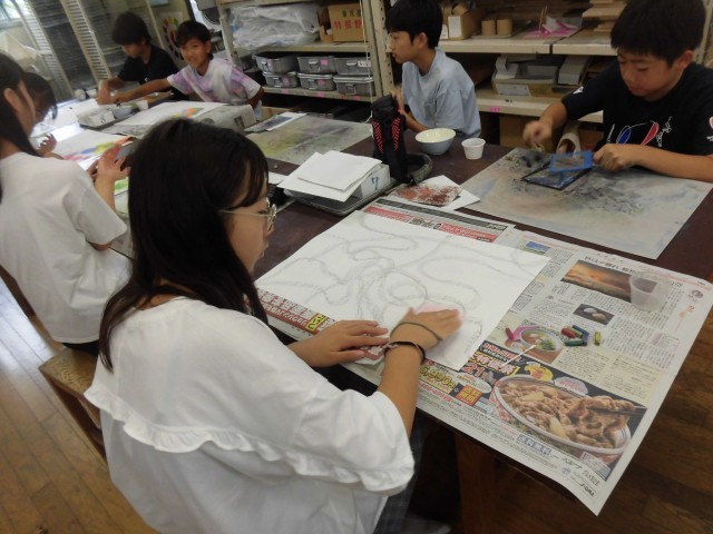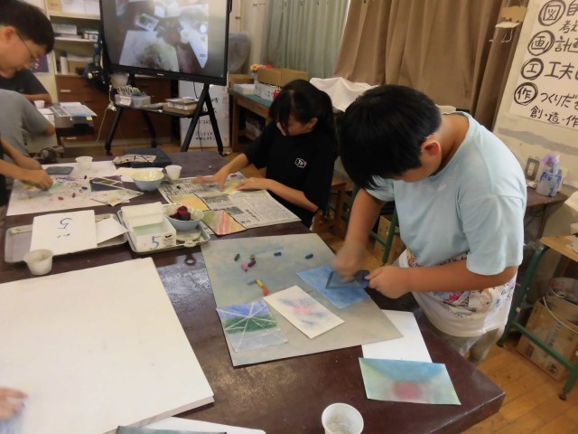 図工では作品展に向けての作品作りが進んでいます。6年生が今取り組んでいるのはコンテパステルという画材を使った抽象画です。テーマは「いのちのかたち」。実際にある物を対象としない抽象画では、より自由な発想や表現ができます。友だちと隣り合って作業をしていますが、ひとつとして同じ作品はありません。子どもたちの豊かな創造力を感じました。網を使ってパステルを散らしたり、消しゴムを軽くかけてぼかしてみたり方法もいろいろです。触感を楽しむように手で大胆に描く児童もいました。大きな画用紙いっぱいにこれからどんな「いのちのかたち」があらわされるのでしょうか。